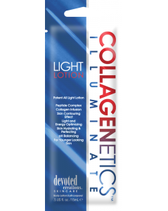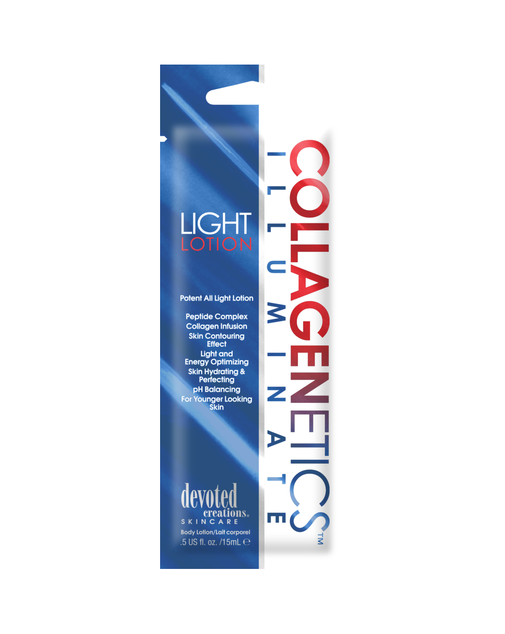 Suteikite jaunatviškesnę išvaizdą su „Collagenetics™ Illuminate“ – revoliucine odos priežiūros linija. pH balansuojantis mišinys – šią formulę optimaliai tinka naudoti prieš visas šviesos procedūras. Pepha-Tight – padeda odai atrodyti stangresnei, atgaivintai ir atkurtai. Obuolių sidro actas – padeda sugerti riebalų perteklių, detoksikuoja bei ramina uždegiminę odą. X50 Photoglow™ – paverčia šviesą ląstelių energija, kad oda būtų švytinti ir elastinga. Regu-Scence™ -padeda sulėtinti natūralų senėjimo procesą, apsaugo nuo kolageno praradimo. Galingas peptidų kompleksas – padeda kovoti su raukšl4mis ir senėjimo požymiais. Veganiškas kolagenas – padeda stiprinti ir kondicionuoti odą, kad pastebimai pagerintų jos tekstūrą ir elastingumą. Hialurono rūgštis – drėkina, kad oda atrodytų stangri ir putli. Jaunatviškumą skatinanti mėlynė – kolageno gamybą skatinantis antioksidantas, kuriame gausu vitamino C. Ciberžolės šaknies ekstraktas – antioksidantas, padeda pagerinti odos išvaizdą, kad atrodytų lygesnė ir be dėmių. Kakavos ir taukmedžio sviestai – įsiskverbia pro sausus odos sluoksnius, suteikdami jai minkštumo ir ilgalaikio elastingumo